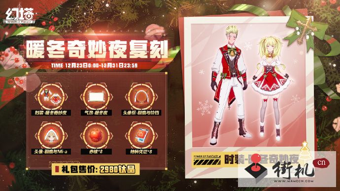 【时装-暖冬奇妙夜】、【气泡-暖冬夜】、【头像框-驯鹿与铃铛】、【圣诞头像-驯鹿与Mi-a】、【赤核*8】、【特种凭证*8】