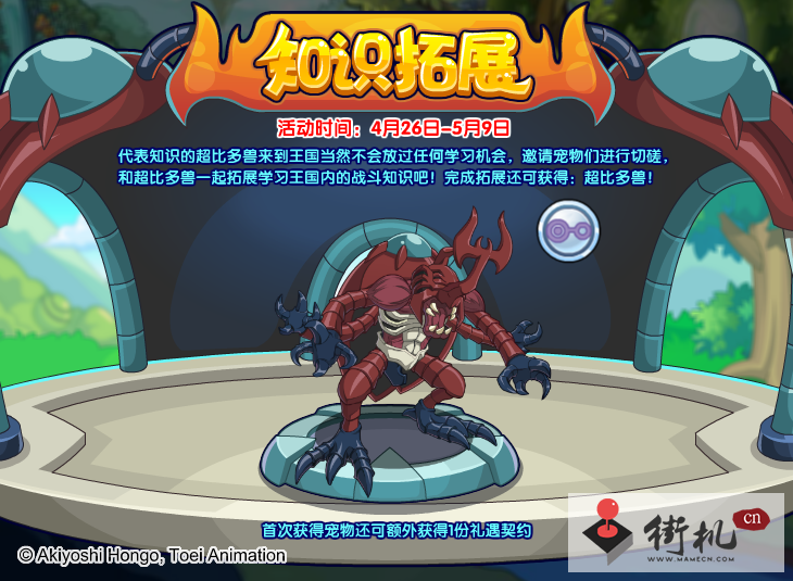 在洛克王国,从4月26日到5月9日,超比多兽即将登场!参与知识拓展活动,每天都有五次切磋挑战的机会。首次挑战成功将赢得5点进度,再次挑战则减少至3点。当你的拓展进度达到80点时,即可召唤超比多兽!只需688洛克钻即可一键购买。