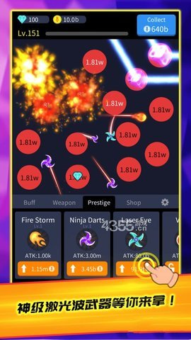 离线也能获得收益,是一款易于控制的闲置点击游戏,可玩性很高。游戏过程中可以使你您忘记简单的烦恼,放松一天紧张的工作、学习。玩家可以通过游戏过程释放压力,并且升级各种武器,体验快乐的游戏。