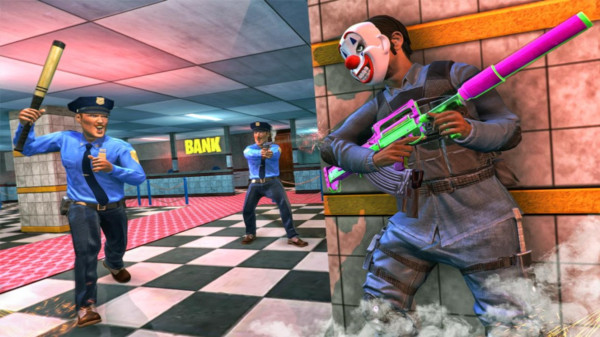 2、玩家需要躲避警察的追逐并且在银行中淘汰警察和自己的同伙完成抢劫金额成功撤退让所有的警察束手无策。