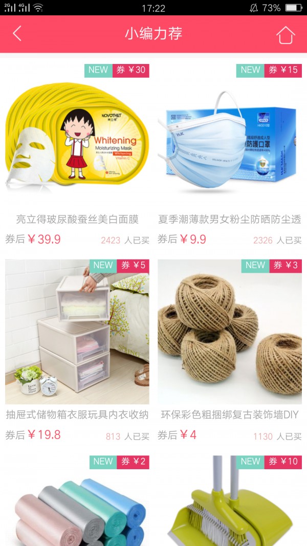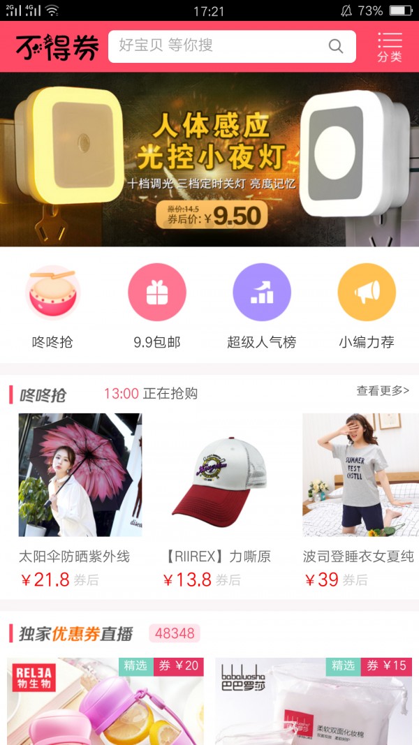 3.手机淘宝的伴生神器,自主搜索宝贝,首页即时更新最新的优惠券,精品类目宝贝高性价比优惠券,领券直接跳转手淘app购买。