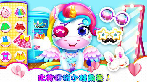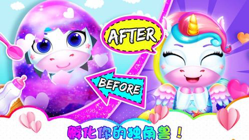 加入游戏和独角兽一起生活玩耍,留下超多快乐美好的回忆吧!先从蛋里面孵化出只属于你的彩虹独角兽吧!接下来,你需要照顾独角兽的衣食起居,为她制作美味可口的彩虹食物,如果颜色不够好看,独角兽就不会喜欢哦!还有为她打造专属的房间吧,你还需要教他学会上厕所,学会看书,培养良好的生活习惯和学习习惯!除了休闲的日常生活之外,你还可以给梦幻独角兽进行装扮!本来就已经很可爱的独角兽经过你的装扮会变得更加好看!搭配上好看的服装和配饰吧!