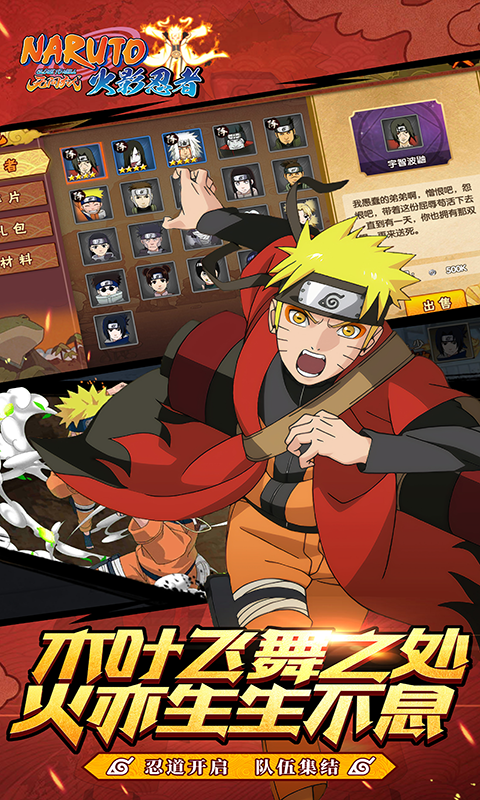 这个游戏是以火影忍者这部动漫作为背景的。能够在这款游戏里面去感受主角们不一样的人生和宿命,同时还能够感受到经典的组合刺激和充满紧张的策略。新玩法已上线,给玩家们带来不同的游戏新体验,赶紧来打造一支属于你的最强忍者小队吧。