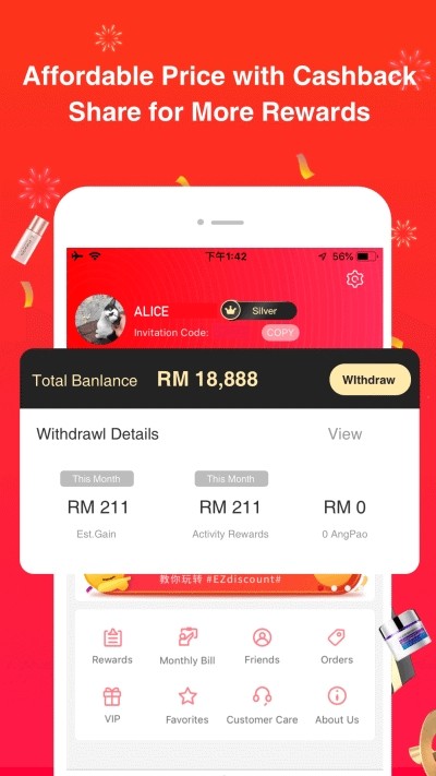 无论是分享EZdiscount给好友,还是分享优质商品给亲友,不仅好友享优惠,自己还能得奖励,高额佣金回馈会员,时时得奖励!