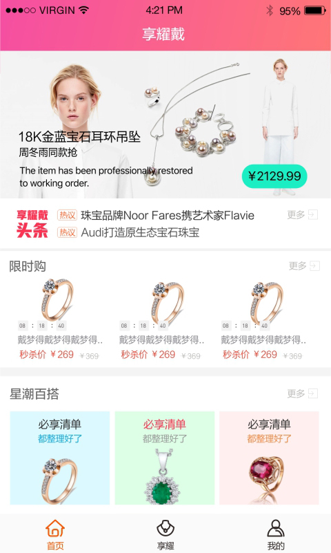 首饰盒里永远缺一件珠宝?出席晚宴、受邀前男友婚礼、参加公司Party,想要搭配昂贵珠宝,买还是不买?造型多变,却唯独首饰单一,高昂的形象包装费,掏还是不掏?享耀戴海量珠宝任性换戴,让你不再为珠宝搭配发愁。 享耀戴是珠宝消费领域的变革者,出厂价既是零售价的珠宝商城。 珠宝“随心换戴 无限换新”的概念,为时尚女性带来海量精选珠宝饰品,打造属于您的个性云端首饰盒。 首倡的“买手”机制,为想要迈入这个行业的人,搭建了一个开设专属采买工作室。珠宝首饰时尚搭配的爱好者在这里相聚,使用的达人们越变越美!