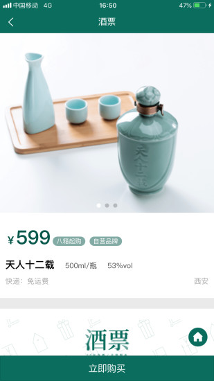 西安加安信息科技有限公司旗下酒票APP,致力打造线上酒水流通与线下存储相结合的新企业零售模式,用户可在我的酒窖对用户的个人存酒进行赠送(赠送给他人)、提货(顺丰快递承运,72小时内送达)、寄卖(存酒达到一定年份的存酒可在酒票APP内拍卖),用户购买的存酒将在恒温恒湿的专业仓库内存储,享受线上下单,线下存储,西安市内两小时内送达,全国72小时内送达。