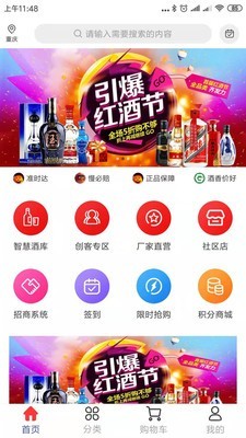 4、一键选酒:热卖好酒、名优白酒、红酒直采、喜宴用酒。