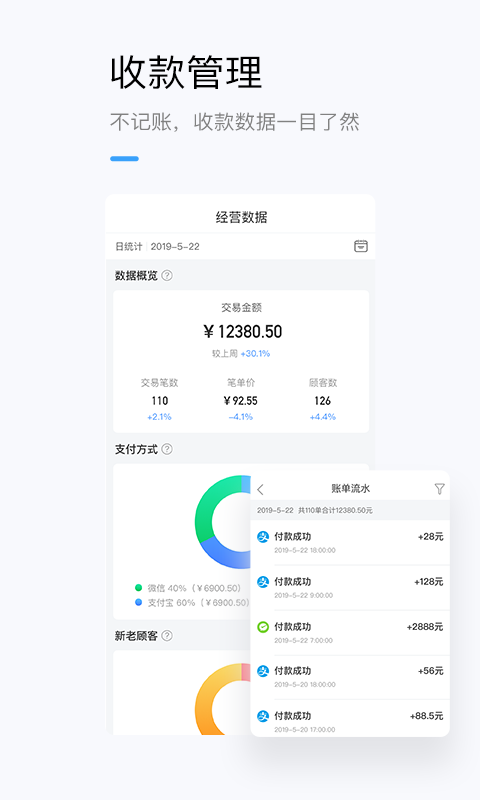 【对账管理】:营业核心数据尽收眼底,交易信息一手掌握,管理账单更轻松;