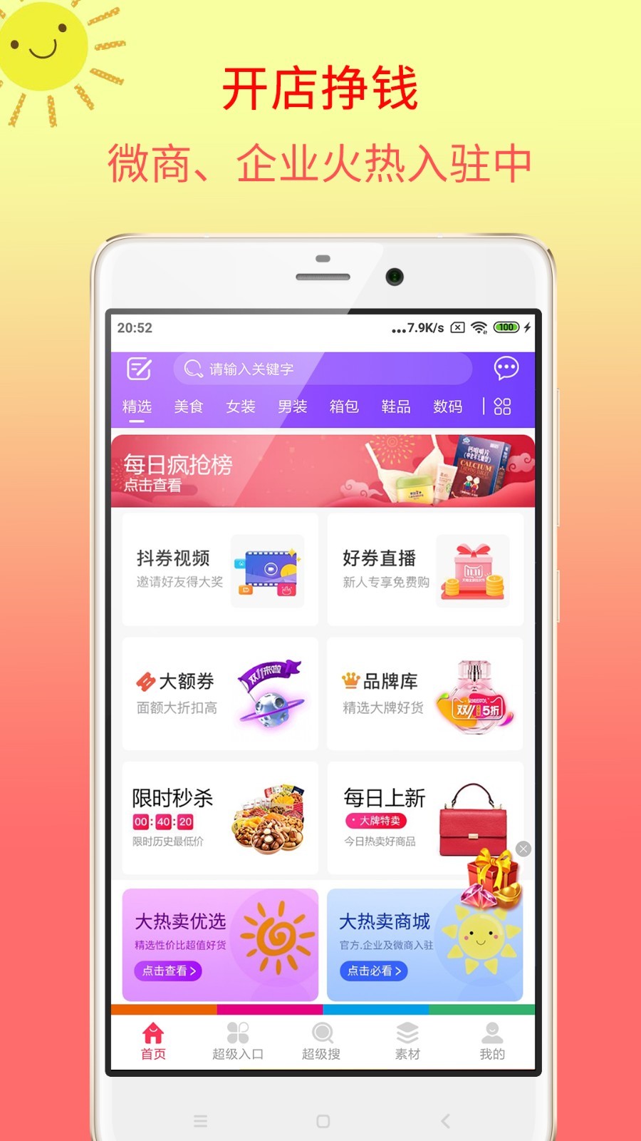 大热卖,是一款汇集多家商家热卖好货,并提供内部优惠券、发红包等功能的全面覆盖生活导购APP,专为网购达人设计的一款网购更实惠、购物能返钱、分享能赚钱的省钱工具!可靠、正规、值得信赖!