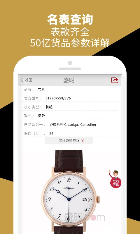 盛时网app是一款专业的钟表选购服务平台,汇聚50多个知名手表品牌总袋里,由腕表品牌商直供,更有专业钟表顾问为您提供一对一在线服务,让您足不出户就能享受优质钟表选购服务,轻松购买正品超低价品牌手表。