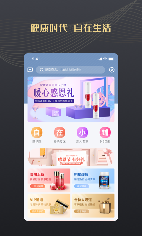 1、品类丰富: 包括大健康、美容保健、美妆个护、服饰配件、母婴用品、家具生活等的全品类商品,一站式满足用户的购物需求;