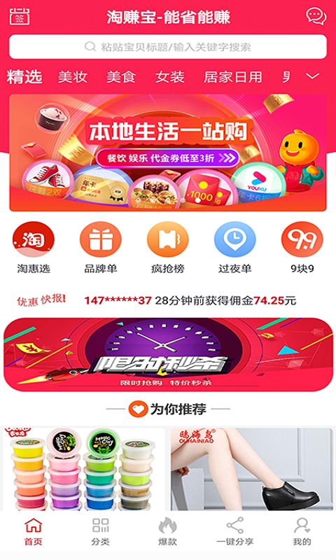 【一键分享】可以将精选单品和好货专场一键分享给好友和朋友圈,轻松赚钱!