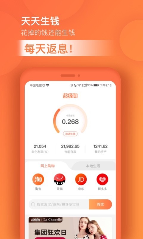 超级淘是一款网购消费存钱应用,用户在淘宝、天猫购物花掉的钱,还能存入超级淘,每天拿利息!赶紧来超级淘开启全新网购赚钱时代。