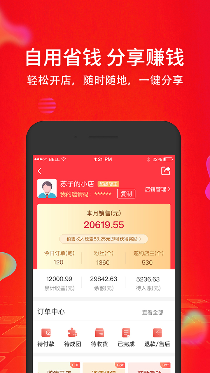 3、一键开店:开店赠送大礼包,自购省钱,分享赚钱。帮您增加一份额外收入。