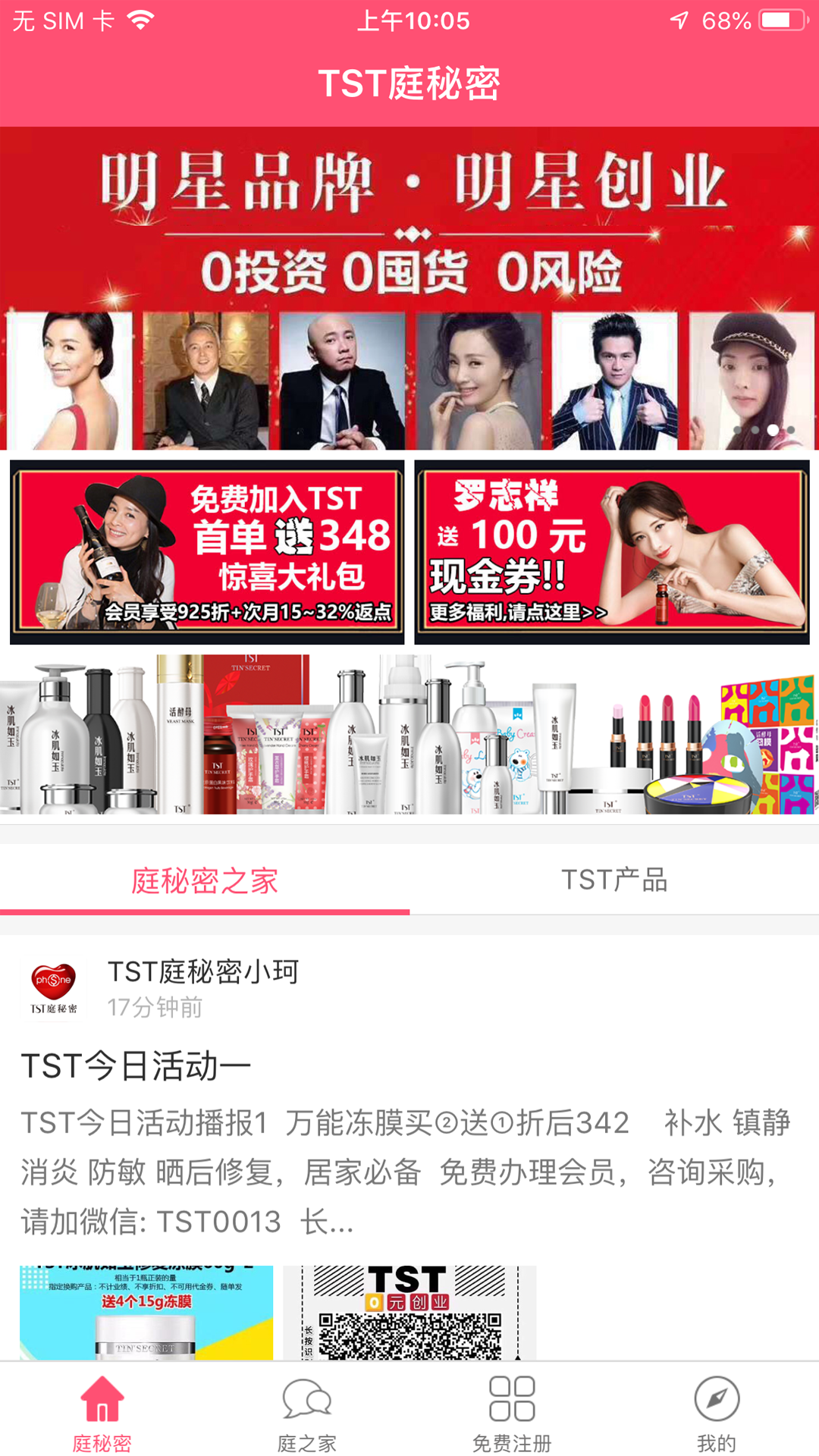 TST庭秘密家人互动学习的社区,提供TST产品购买、咨询、庭秘密各种素材、创业话题、课程培训等! 第一时间发布TST庭秘密相关公告、新闻、产品知识等,提供微商课程和素材,让你做TST微商更容易! TST特别关心女性的生活形态与内在需求,发现她们在忙碌之余任然美丽耀眼,并受到众多女性的喜爱。 在庭秘密: 你可以分享你的文字和图片信息。 让你的朋友了时刻解你的动态。 庭秘密商城,有你想要的各种美妆。 关心女性的生活形态与内在需求。 在忙碌之余依然让你美丽耀眼。