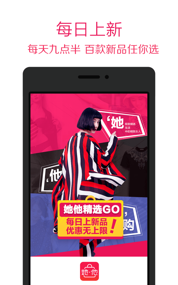 她他精选是以单品购形式的特卖活动,专注高性价比的爆款单品,包含服饰,鞋包,美妆个护,居家日用,运动户外,3C数码,食品生鲜等全品类商品;同时为了便于浏览,区分男女频道,方便您为他选,为她选。