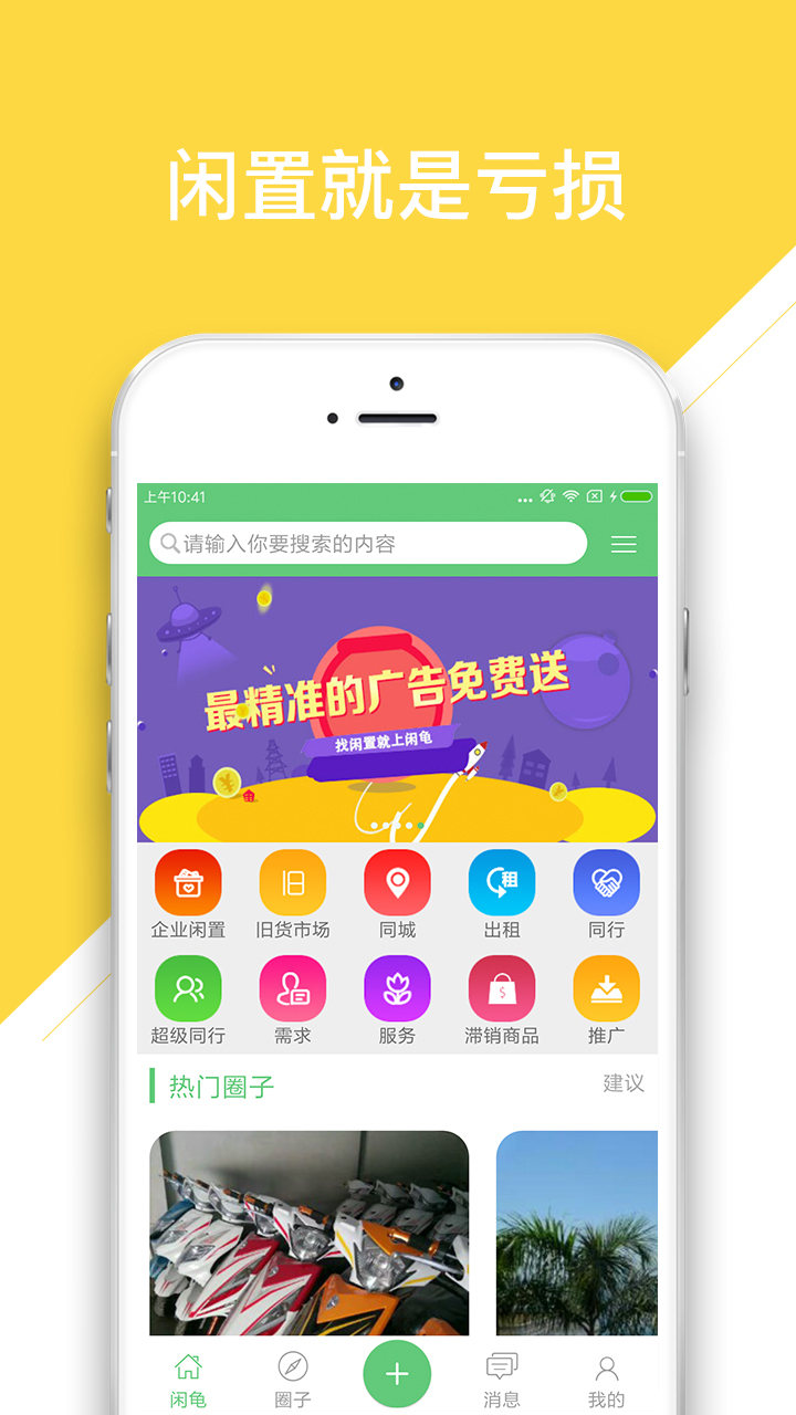 闲龟APP是一个专业的企业及个体工商户闲置物品展示交易,包括:“闲置”厂房、土地、商铺、写字楼、机器设备、办公用品、办公家具、电子电器、运输工具、物资、下脚料、宾馆酒店饭店物品等等,及为企业提供的各种服务包括:维修保养、园林绿化、家具运输组装等等。
