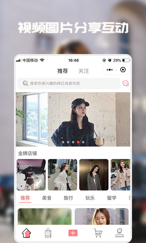 在上面可以看到各种精彩的小视频和内容图片笔记。记录了时尚网红们的生活瞬间、和用户们的各类精彩日志,网红们会将自已的时尚眼光及服装,分享给所有人。商城中,有平台和网红们精选的潮流服装,及各类搭配、活动抢购。