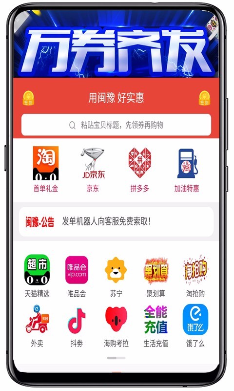【闽豫】是一款汇聚了各大购物电商平台的一款APP,使用【闽豫】可以领取专属隐藏的优惠券,让您购物省钱!好物分享好友,也可以赚钱!是百万购物达人认可的一款,购物省钱,分享赚钱的APP!