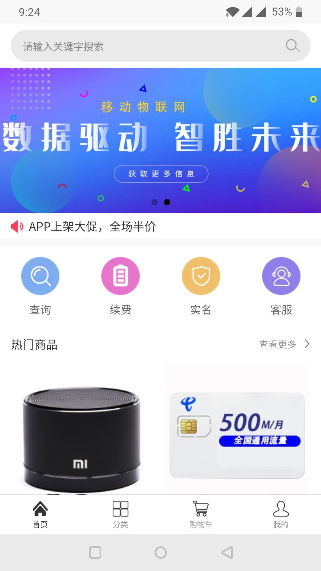 本应用提供了设备流量卡的管理和信息查询。客户扫描卡片上的二维码,下载本应用,进行查询和续费。此外,APP还提供了主流智能设备的在线销售,欢迎大家选购。