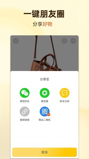 4.分享购物:一键启动生意,通过在微信、qq、微博、支付宝、陌陌、贴吧等社交平台分享链接或发布状态,即可点击进行交易;