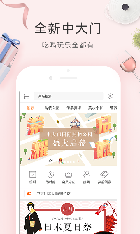 中大门,买全球,卖全球,原装进口,保税直发,尽享折扣。遍及28个国家,全球好货精挑细选,涵盖进口母婴用品、美妆个护、服饰鞋包、居家日用、生鲜美食等,满足一切购物需求。