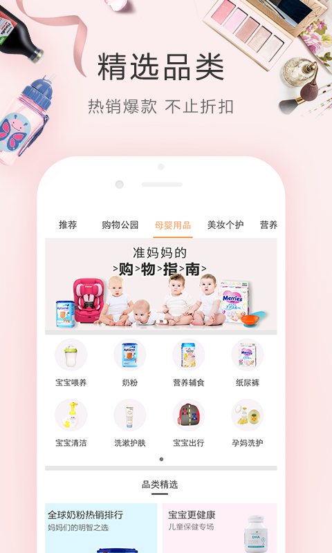 2、品类内容丰富,涵盖进口大牌奶粉、纸尿裤、美妆个护、服饰鞋包、进口美食、居家日用、营养保健等。甄选全球好物,追求品质生活。