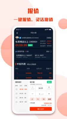 2.拍卖功能,每日开拍后,拍场根据标的数量开启多个拍卖大钟,并显示大钟待拍的商品数量和等级,采购商可根据采购需求,进入对应的大钟参拍。