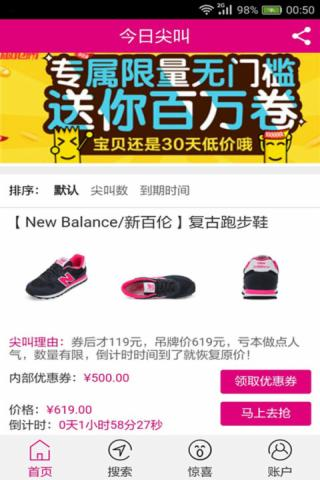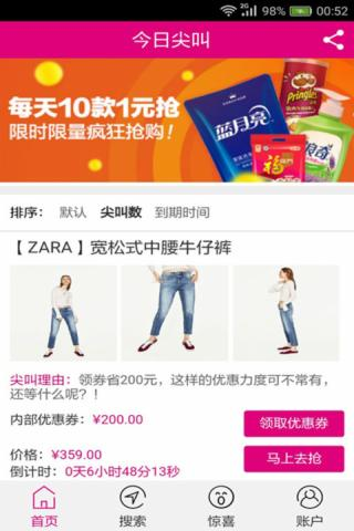 今日尖叫app是一款网络购物软件,用户通过今日尖叫app可以随时在线领取商品优惠券,让购物变得更省钱。
