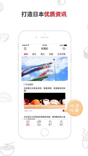 作为《东京印象》、《地方印象》节目唯一指定App,为丰富现节目的资讯内容,我们针对所有访日中国旅客,结合互联网以及社交媒体,以提升实用性和便捷性为宗旨开发免费提供日本本地最新实用资讯的功能细分化,综合型的平台。我们提供最丰富的资讯让游客更了解日本,提供最人性化的旅游路线让各位来一场说走就走的日本之旅,这里还有最红的日本商品,让大家足不出户就可以买到日本最时尚的商品。