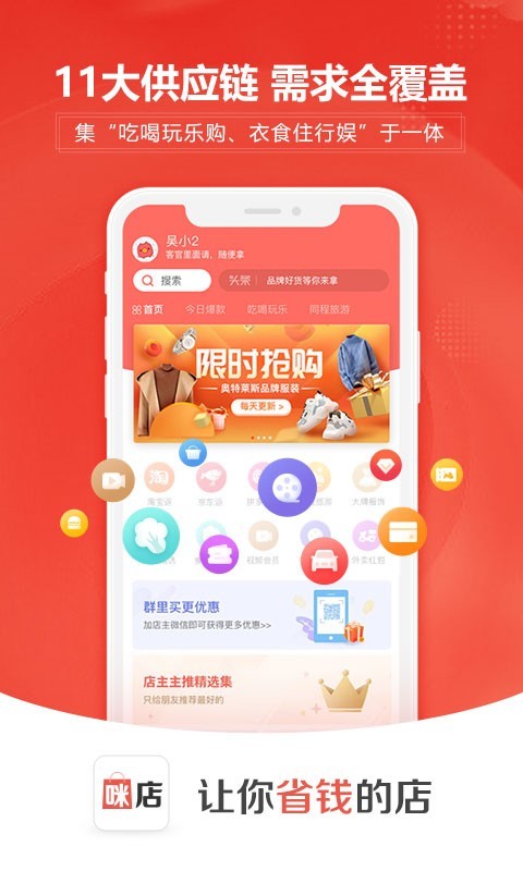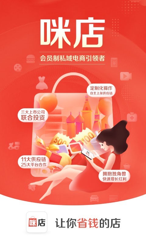 咪店,是由腾讯系上市公司同程艺龙打造的会员制私域电商平台。以“私域流量+会员制+无界商业”为底层商业逻辑,旨在打造一套满足用户全部生活需求的去中心化线上会员制商城。品牌秉承“私域+无界”的商业理念,与淘宝、京东、拼多多、美团、同程旅游、等互联网巨头深度合作。集合11大品类供应链于一体,构建出“电商购物+本地生活+社区生鲜+旅游福利”的全形态商业平台,通过赋能私域流量,重构商业渠道;基于“无界电商”的核心理念,满足用户吃喝玩乐购的所有生活需求,真正实现购物更省钱的商业价值闭环。