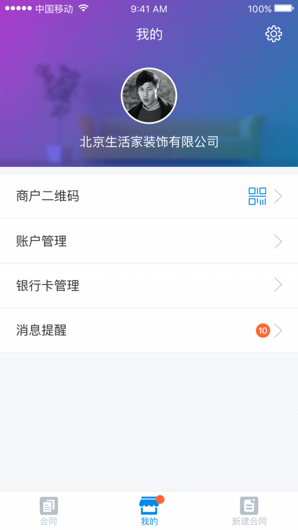 核心功能:“合同”、“我的-商户的个人中心”、“新建合同”