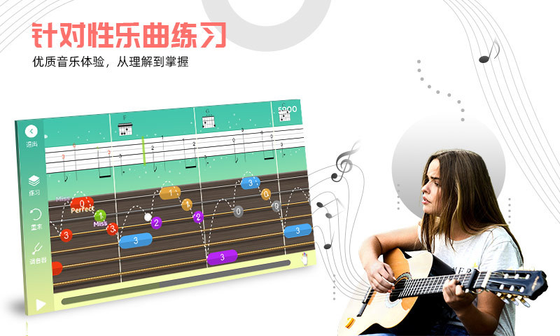 (初学入门者)我们有系统的吉他入门教学和配套的乐理、基本功练习,配上我们先进的互动识别和游戏模式,全面帮助初学者度过入门难关。