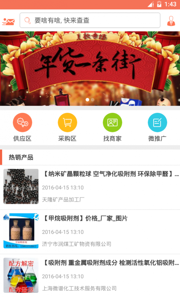 指寻app是一款网上购物商城应用软件,包含供应区、采购区、找商家、微推广四大板块,为用户找产品、找企业、找客户提供方便,还可以随时随地查看最新行情。