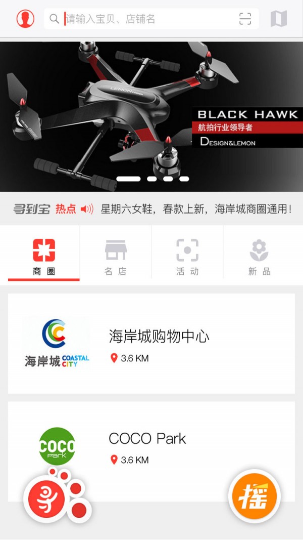 3、提供商圈,名店,新品浏览方式以及地图模式导航;提供三种摇一摇的方式让用户摇取宝贝,还可以做任务、拍卖物品、使用道具等内容与功能。
