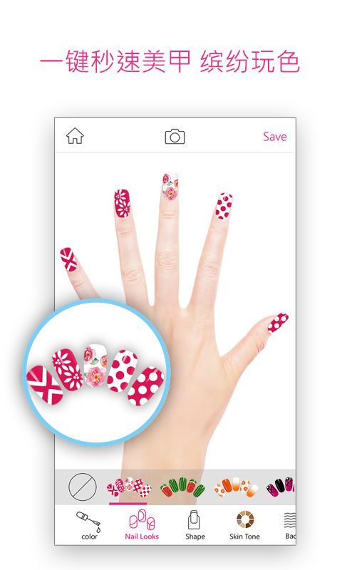 你可以立即拍摄或使用內建手模照片来进行设计,并透过肤色來个人化你的美甲照片