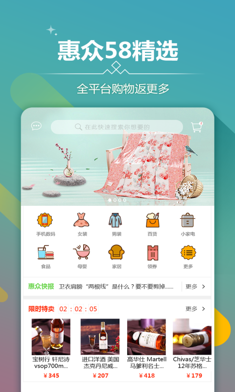 惠众58 app是一款手机购物软件,涵盖衣食住行等全方位,致力于满足广大消费者的购物需求,轻松购物,便捷生活。