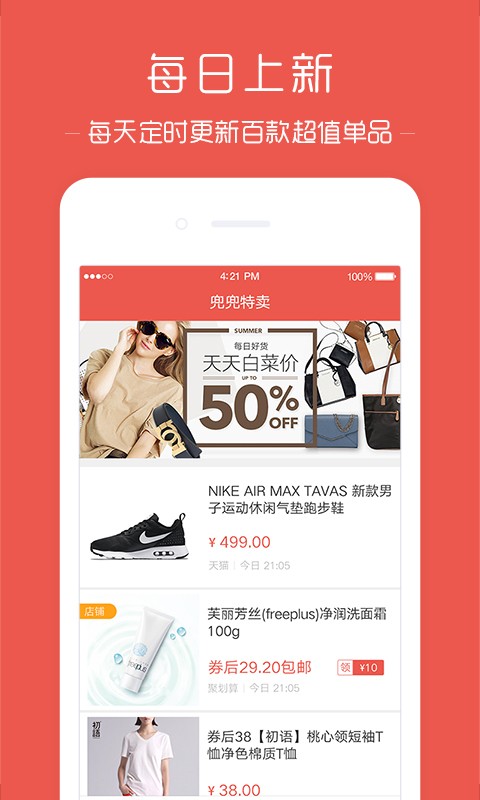 每天定时上新,覆盖女装、服饰、鞋包、化妆品、零食、居家百货等品类。