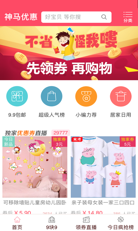 抢淘宝天猫折扣特价,就用神马优惠9块9包邮省钱神器!