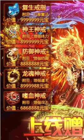 1.上线赠送VIP10,38888元宝,88888888金币