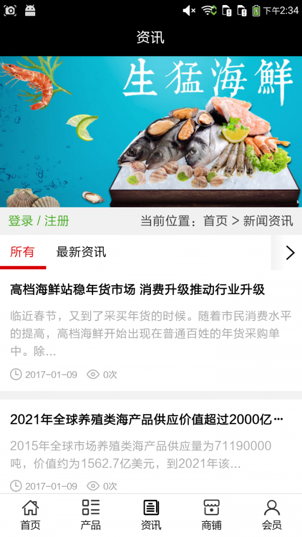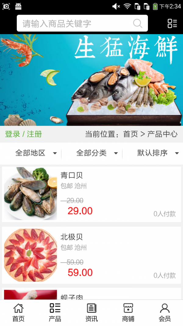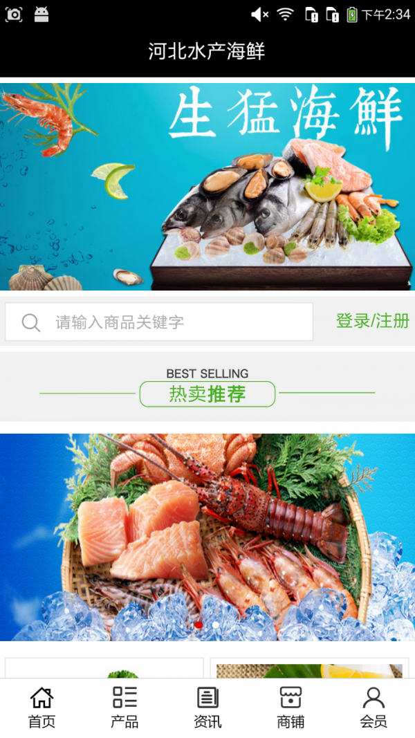 河北水产海鲜app不仅具备购物、查询订单、搜索商品、行业资讯和产品评价等常用功能,而且还实现了手机版特有的会员注册登录、广告位、招商开店等功能。