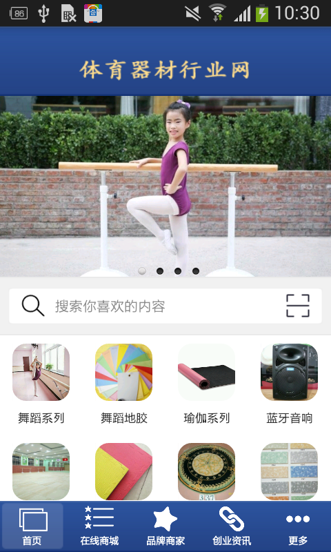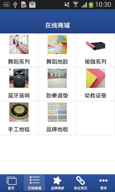 “分类齐全,丰富多样” 分为舞蹈系列、舞蹈地胶、瑜伽系列、蓝牙音响、跆拳道垫、幼教设备、手工地毯、品牌地板等类别,只有想不到,没有买不到的;