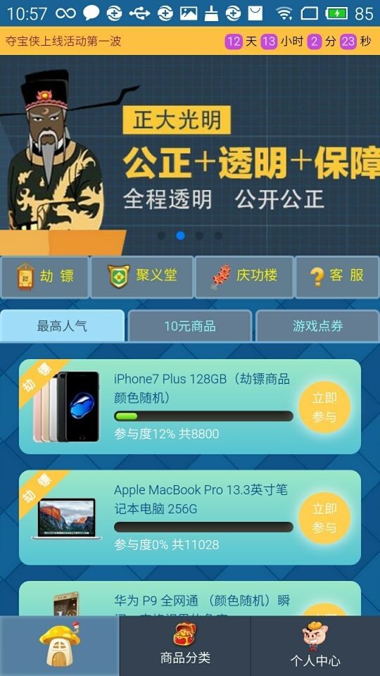 夺宝侠app是以以古侠情为背景的一款夺宝产品,以时下流行的购物方式和娱乐体验出发,只需花1元,就可以获得当下诸多热门商品。