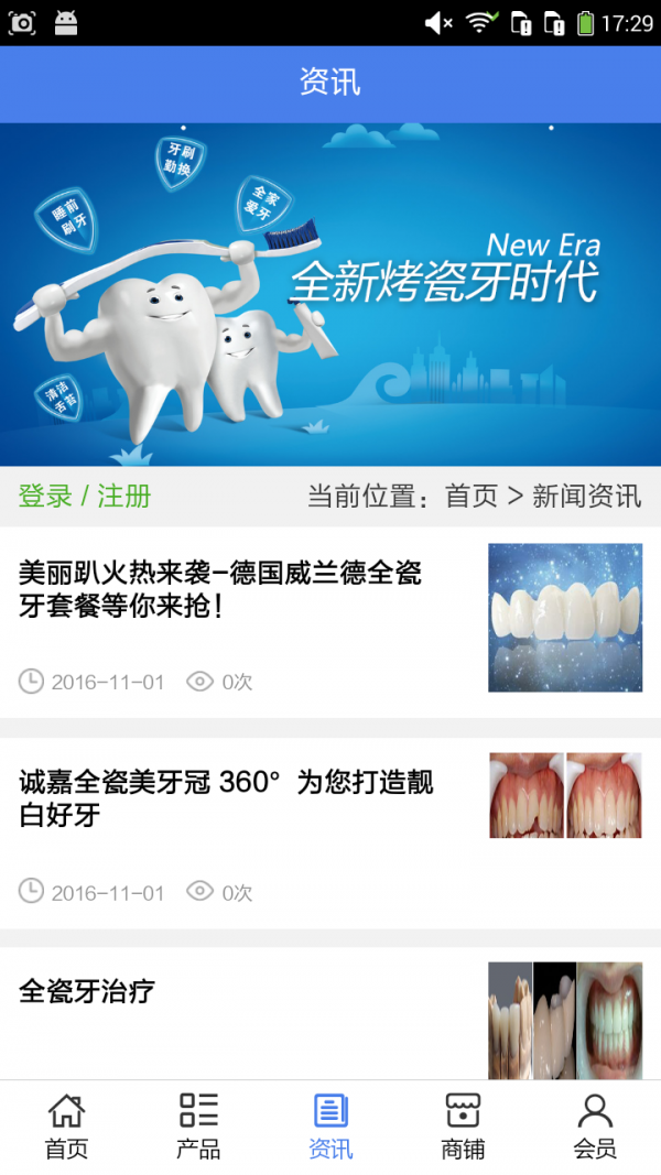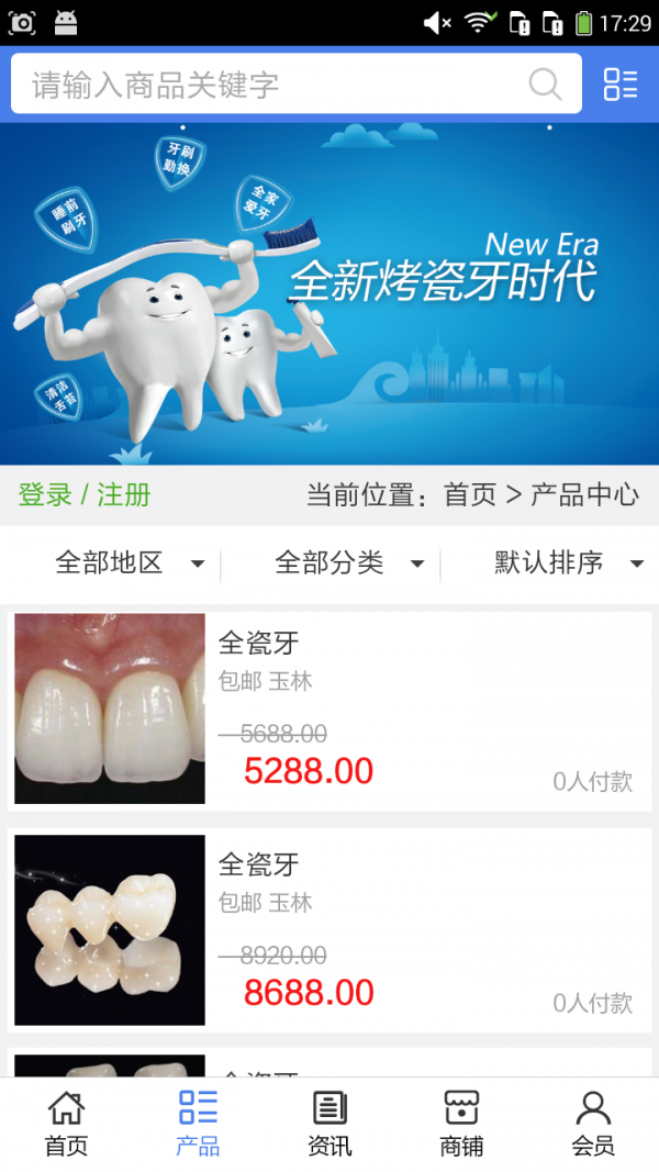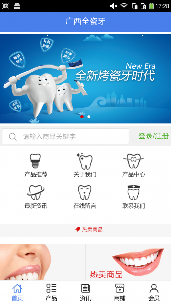 广西全瓷牙app不仅具备购物、查询订单、搜索商品、行业资讯和产品评价等常用功能,而且还实现了手机版特有的会员注册登录、广告位、招商开店等功能。