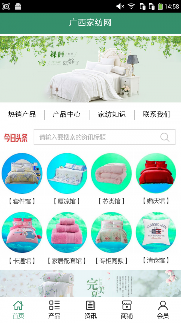 广西家纺网客户端不仅具备购物、查询订单、搜索商品、行业资讯和产品评价等常用功能,而且还实现了手机版特有的会员注册登录、广告位、招商开店等功能。