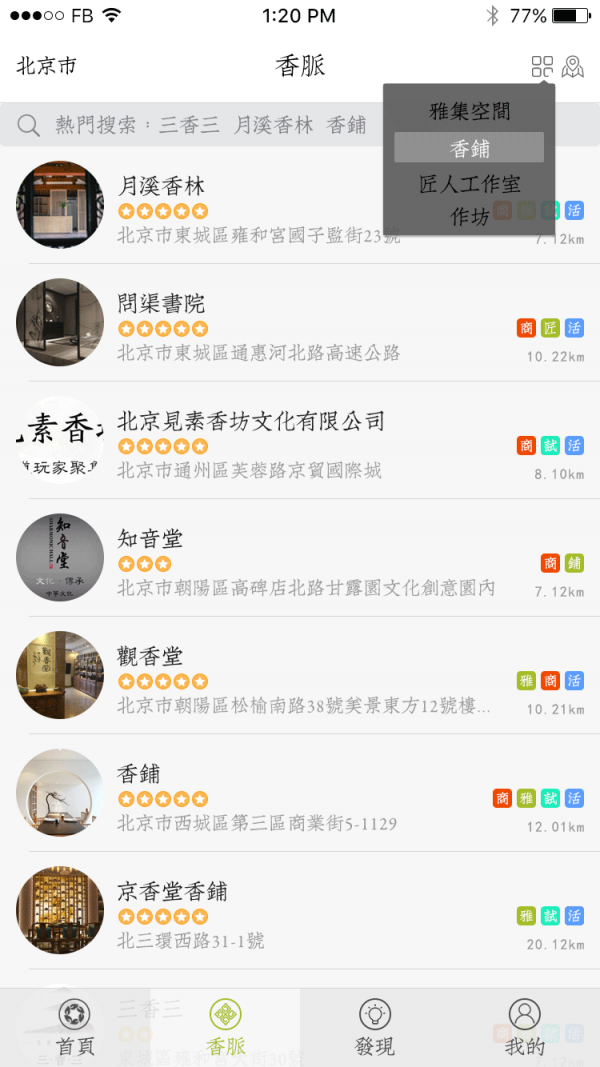香脉内包含雅集空间,匠人工作室,香铺,制香厂的地图定位,以及店铺的预约,品香,雅集活动报名等。香友圈实时信息发布,评论回复等。还有相关的香资讯,香人香事,香的课堂等。