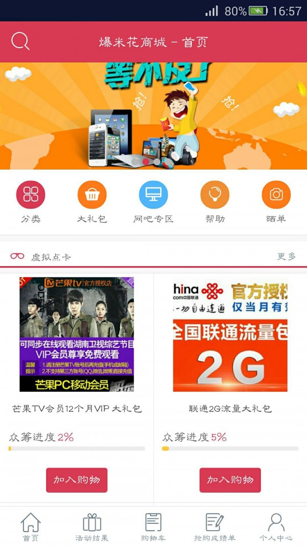 爆米花商城类型众多,品种齐全。除了大型节日活动外还会有不定期的折扣和回馈,来吧,亲!购你所爱,抢你所待吧!