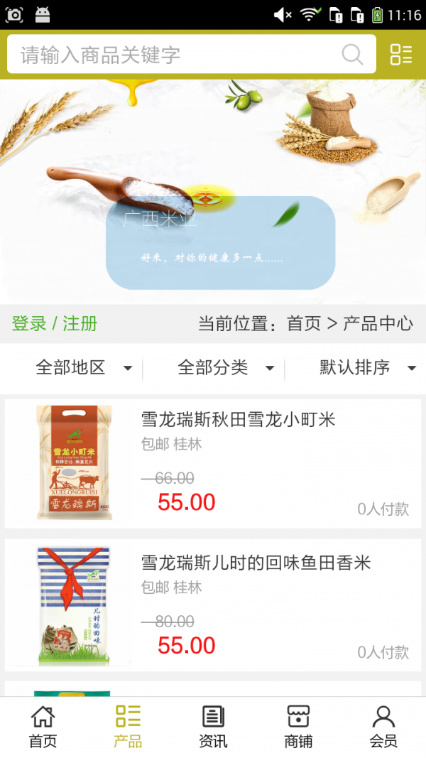广西米业app不仅具备购物、查询订单、搜索商品、行业资讯和产品评价等常用功能,而且还实现了手机版特有的会员注册登录、广告位、招商开店等功能。目标是整合当地品牌商、生产商、经销商,为商家和消费者之间提供一站式解决案。欢迎下载使用!