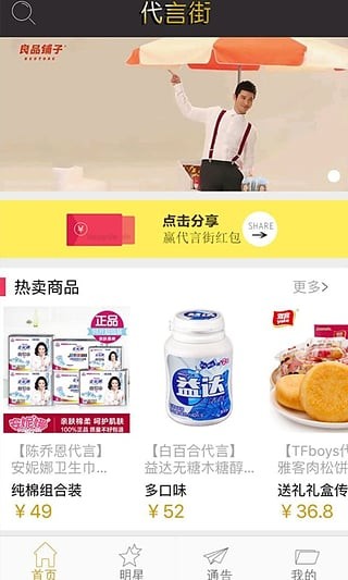 1、代言街APP,不仅汇集了国内外明星与网红代言的系列商品,还会联合品牌商户推出限时折扣及明星见面会活动;