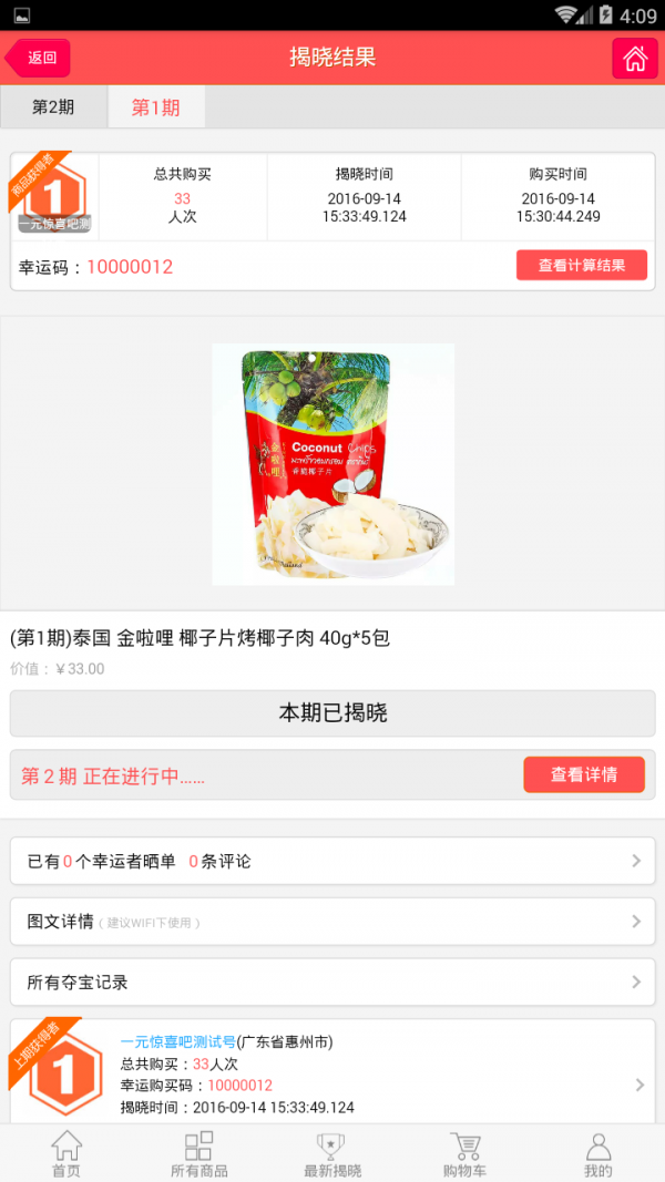商品分配对应数量的号码,每个号码价值1元人民币;当一件商品所有号码售出后,根据预先制定的规则计算出一个幸运号码,持有该号码的用户,直接获得该商品。